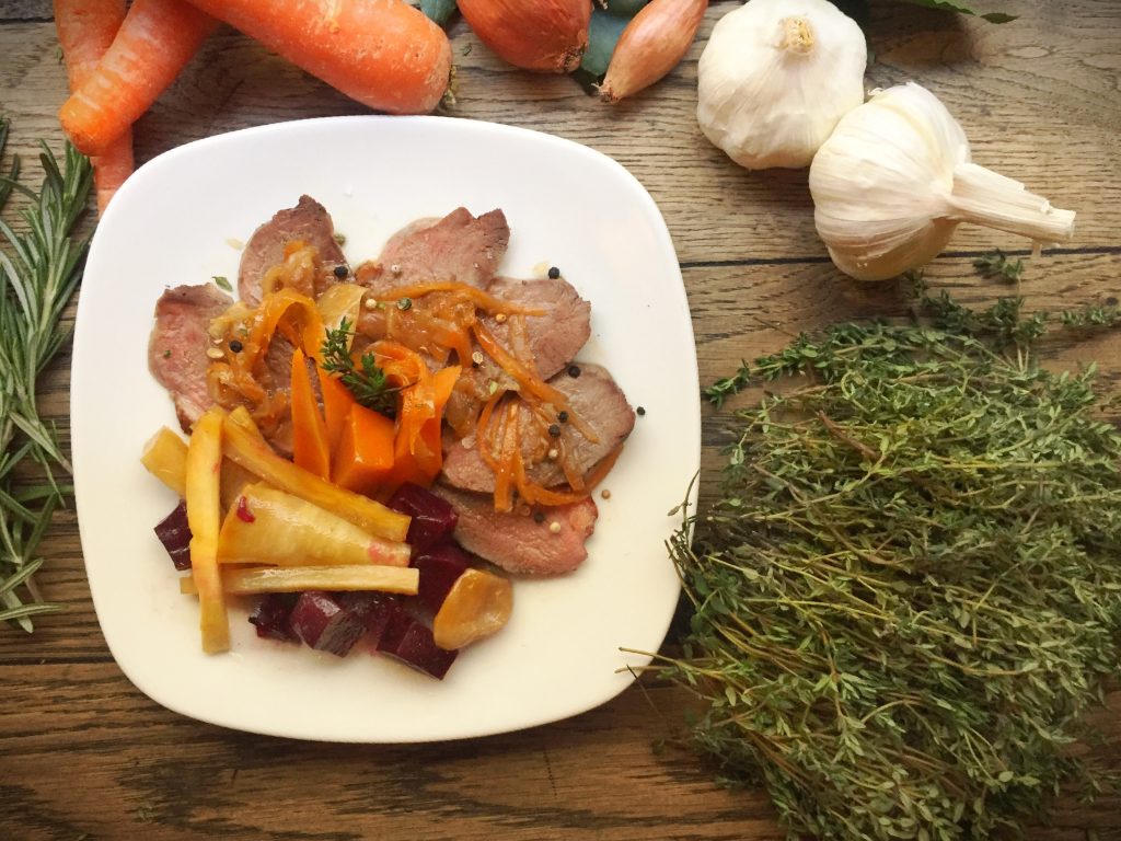 Pato azulón escabechado con tubérculos de invierno